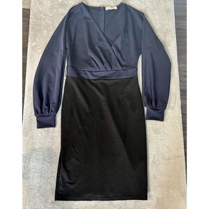 The Grace Karen Navy Blue and Black Belted Women's Size Small Cocktail Dress is a stylish and sophisticated choice for any party or special occasion. Made of polyester, this knee-length dress features a flattering V-neckline, long balloon sleeves, and a classic pencil dress style. The belted waist adds a touch of sophistication to the ensemble, making it perfect for summer, fall, and spring events. With its solid black color and timeless design, this dress is sure to make a statement at any cocktail event.