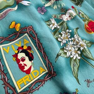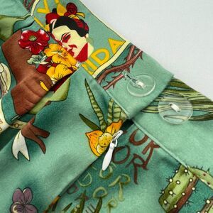 Gorgeous Frida Kahlo Skirt by Grace Karin. Plus size women's XXXL / 3XL. Box pleats, 1 Pocket, zip/button side closure. Adjustable 2-button setting for waist, for all-day comfort. No visible content tag but assumed 100% cotton. Flattering, feminine. Approximately knee length; see dimensions and details in photos. Unlined but not see through. Vibrant, artistic imagery of Frida, hearts, floral, botanical, cactus, aloe, flowers, "VIVA FRIDA" ("long live frida"), "nada vale mas que la risa y el desprecio" ("nothing is worth more than laughter and contempt"), "en un sueno viviremos los dos--los dos" ("in a dream we will both live -- both of us".)