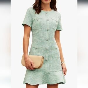 FEATURES: Round neck, bodycon mini dress,above the knee, hidden back zipper, tweed knit fabric, four pockets,ten decorative crystal buttons, no lining, and ruffle design at the hem add a touch of trendy, a business casual work dress for women 2025