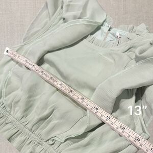 Style: Flutter sleeves, ruffle neckline, elastic waist, handkerchief hem