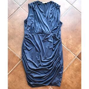 Lots of gathers and ruching in this drape-y dress from Grace Karin in very good condition. No stains, snags, tears or holes noted. You can wear it with a plunging neckline or with a modesty snap. Beautiful midnight blue color. Measures 17 inches pit to pit and 14.5 across waist. Material is very stretchy and slinky.
