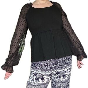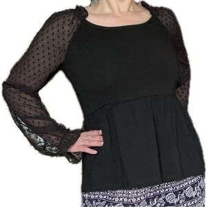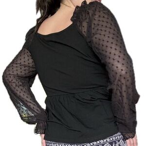 Features sheer sleeves.