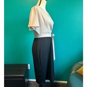 This taupe and black women's dress is made by Grace Karin. This dress has a faux wrap v-neckline, short sleeves, midi length skirt and a fabric tie belt. It has a zipper back closure. Perfect for the office or semi formal events. In good condition with no visible flaws, rips or stains. 95% polyester, 5% spandex. Women's size large.