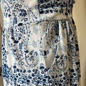 Elegant strapless dress with a blue and white pattern. Perfect for any occasion. Comfortable and stylish.