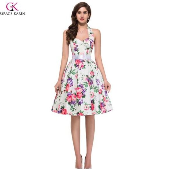 Grace Karin Vintage Halter Floral Print Sleeveless High Waist Ball Room dress