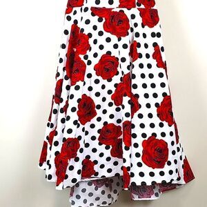 Grace Karin Halter Swing Dress in a rose floral. This dress features large black polka dots and red cabbage roses on a white background, sweetheart neckline, a-line fit with a high low hem, smocking in the back for a comfortable fit, hidden back zipper, and ties around the neck. Fun 1950's style dress to wear for any occasion or the next soc hop! Size XXL.