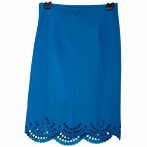 This NWT teal above the knee pencil skirt has a hidden waistband and back hidden zipper. The front drapes and the hemline has a scalloped cutout design.
