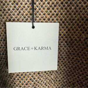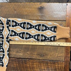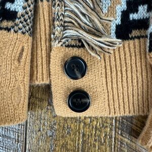 Cozy meets chic! This Grace + Karma cardigan sweater in size Small is the perfect layering piece for fall and winter. Featuring a bold Aztec/Southwest-inspired knit pattern in camel, black, and cream, with statement fringe trim along the collar and front. Designed with a button-front closure, ribbed cuffs, and hem for added warmth and style.