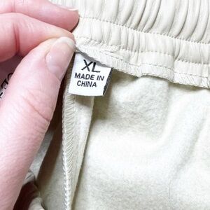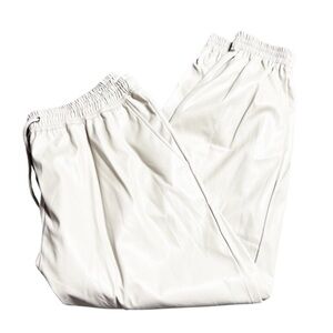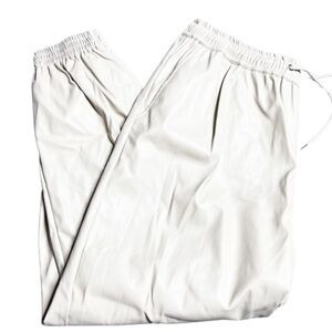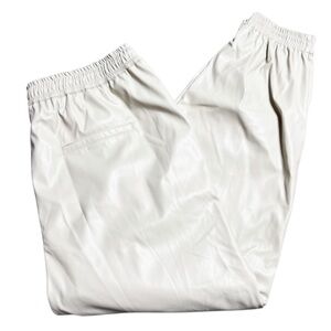Grace + Karma Women’s Leather like joggers. Cream, Beige color. High waisted. Elastic waistband with drawstring adjustment option. Full length pants with elastic leg/ ankle cuffs. Non-functional back pocket slit. Side/ hip pockets on front. Preloved condition. Never worn, no flaws. Size XL. Made in China.