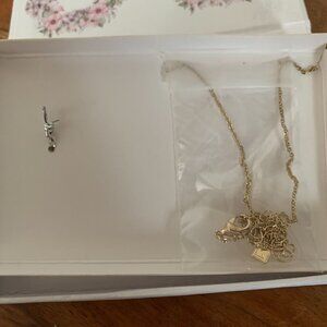 This charming jewelry set features a necklace for cat enthusiasts and a matching collar charm for their feline companions. New in gift box. Gold tone metal. Necklace has a lobster clasp and is 16" in length end to end with a 2" extender and logo charm. New in box.