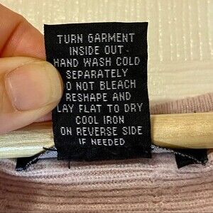 This sweater features a crew neck with a rounded hem. It is a beautiful pale pink color and looks so good with ivory pants.