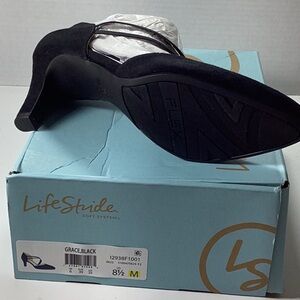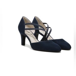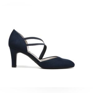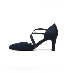 Move as you wish in this classic pump with stretchy straps. Eco-microsuede or fabric upper with an almond toe, slip-on fit, and asymmetrical stretch gore straps. Insole board, toe box, heel counter, linings, and eco-microsuede partially crafted with recycled materials.