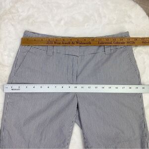 Gray & white seersucker stripes, Stretch twill fabric, Front slash pockets, Flat front, Button slide hook zip fly (button missing), Back button close welt pockets, Mid rise
