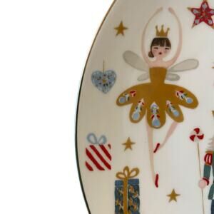 These fabulous plates feature highlights of the Nutcracker Ballet - Ballerinas, Nutcrackers, the Mouse King, the Sugar Plum Fairy with additions of gifts, trees, ornaments, rocking horses and a big red bow at the top - the perfect accent to your Holiday tablescape this season.