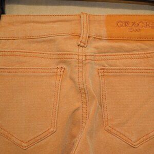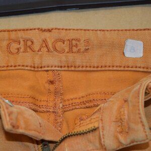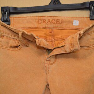 Get ready for retro style with these adorable Grace in LA flare pants! These youth size 8 pants feature a comfortable mid-rise fit and a trendy flare leg, perfect for adding a touch of 70s-inspired charm to any outfit. Made from a denim material in a warm peach/rust orange hue, they offer both comfort and unique style. Excellent used condition with no visible flaws.