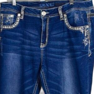 Grace in LA Floral Embroidered Taped Leg Dark Wash Distressed Jeans Size 34