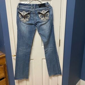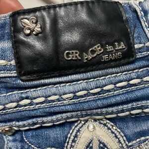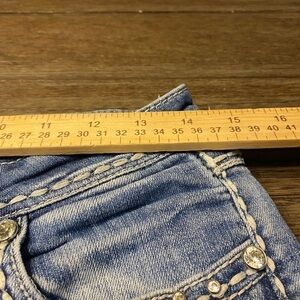 Grace in LA Jeans Bootcut 28x32 Denim Blue Flap Pockets Thick Stitch Bling
