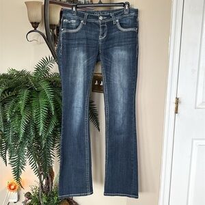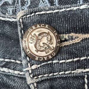 Grace in LA Jeans Low Rise Y2K Embroidered Beaded Cross Detail Boot Cut Denim.