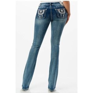 The Grace in LA women's bootcut jean in Easy Fit shows off your best shape by featuring a higher rise. The denim fabric features a softer and higher stretch for exceptional comfort all while maintaining a denim look. The mid-rise creates a form-flattering fit for every curve. The jean is detailed in a feather embroidered design on the back pockets with embellishment, added embellishment on the front pockets, natural hand-sanding, and whiskering. They look like they've been yours forever.