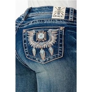 Grace in LA Women's Aztec Western Embroidered Feather Bootcut Stretch Jeans