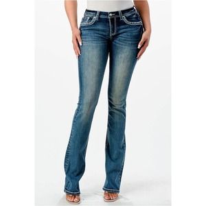 The Grace in LA women's bootcut jean in Easy Fit shows off your best shape by featuring a higher rise. The denim fabric features a softer and higher stretch for exceptional comfort all while maintaining a denim look. The mid-rise creates a form-flattering fit for every curve. The jean is detailed in a steerhead/feather embroidered design on the back pockets, added embellishment on the front pockets, natural hand-sanding, and whiskering. They look like they've been yours forever.
