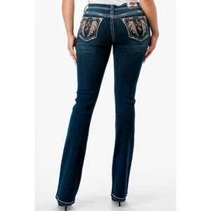 The Grace in LA women's bootcut jean in Easy Fit shows off your best shape by featuring a higher rise. The denim fabric features a softer and higher stretch for exceptional comfort all while maintaining a denim look. The mid-rise creates a form-flattering fit for every curve. The jean is detailed in a wing/cross embroidered design on the back pockets, added embellishment on the front pockets, natural hand-sanding, and whiskering. They look like they've been yours forever.