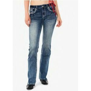 The Grace in LA women's bootcut jean in Easy Fit shows off your best shape by featuring a higher rise. The denim fabric features a softer and higher stretch for exceptional comfort all while maintaining a denim look. The mid-rise creates a form-flattering fit for every curve. The jean is detailed in a steerhead feather embroidered design on the back pockets with crystal embellishment, added embellishment on the front pockets, natural hand-sanding, and whiskering. They look like they've been yours forever.