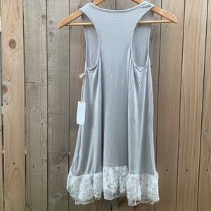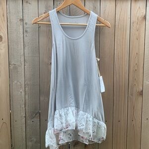 Grace & Lace light grey tank top with floral print/lace trimming. Front is longer than the back.