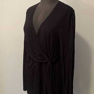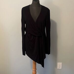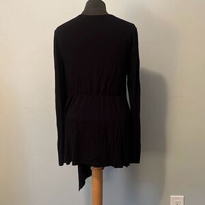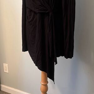 Long, black asymmetrical shirt. Has a wrap tie around the waist on the left hand side, with a few loose threads. Shirt ties to a V neck. Shirt has a few small bleach spots on the back of the left shoulder.