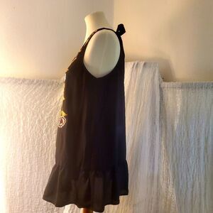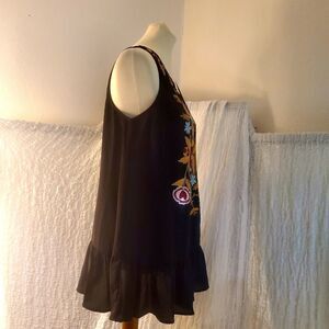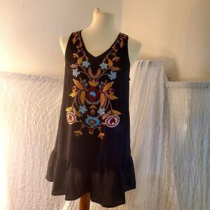 Black sleeveless top with colorful embroidered design on front. Ties on the back. Bottom ruffled detail. It's a little on the longer size. Pre-owned in excellent condition. Please refer to pictures for best description and condition verification.