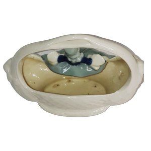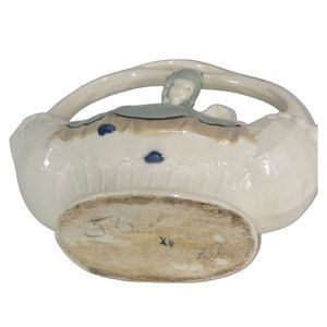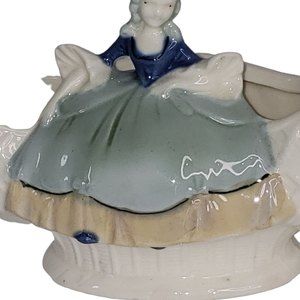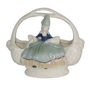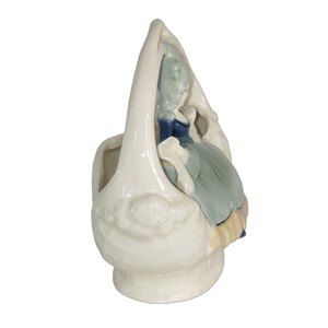 This elegant Edwardian blue and white porcelain lady figurine vase from Japan features a Victorian-style lady in a beautiful blue and yellow gown, complemented by her striking high beehive hairstyle. The vase showcases a delicate basket weave design with reticulated open handles, measuring approximately 5" in height, 5" in length, and 2" in width. While there are minor chips on the inside rim, the piece remains in great condition overall, making it a charming addition to any collection..