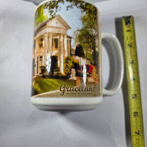 This 12 oz ceramic coffee mug features a vivid depiction of Graceland, offering a functional and decorative piece for collectors and Elvis fans alike.