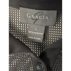 In excellent clean condition. The Gracia A-Line Long Sleeved Mesh Trim Shirt Dress in size L is a stylish and elegant choice for formal occasions or parties. The black polyester dress features a collared neckline, long sleeves, and a button front closure. The dress is made with a lace fabric type and has a midi length, perfect for the summer, fall, and spring seasons. With its designer theme and flower accents, this dress from Gracia combines sophistication and femininity in a classic A-Line silhouette.