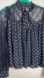 Chic black blouse with white polka dots. Elegant lace sleeves. Perfect for stylish occasions.
