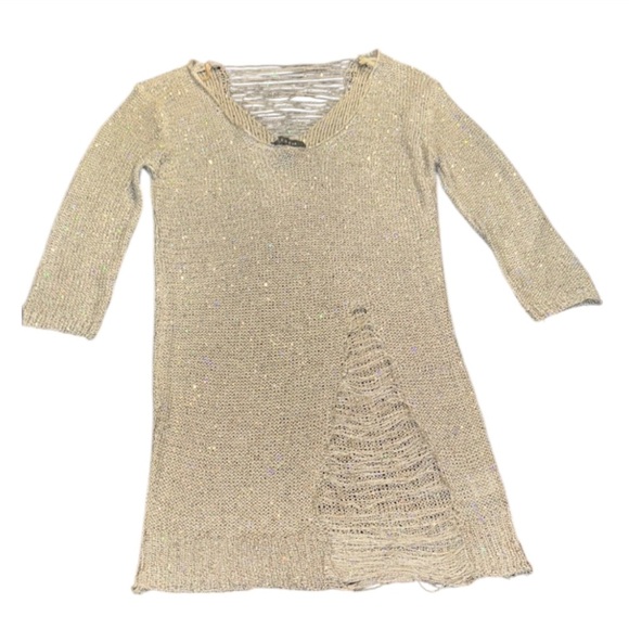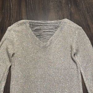 Elegant knit sweater with shimmering details. Features a stylish distressed design. Perfect for a night out. Has good stretch.