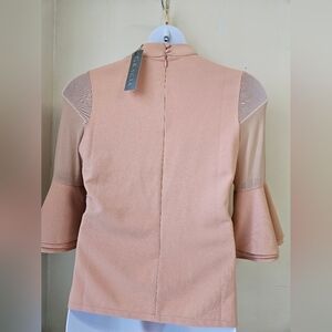 This elegant blush top features stylish bell sleeves and a chic high neckline. Perfect for any occasion.