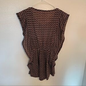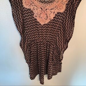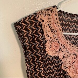 Good condition, minor wear. Gracie. Batwing blouse. Scoop neck. Black with light pink geometric pattern. Crochet and pearls at neckline. Style T6110. Size small. 100% polyester. Pit to pit laying flat 13” Shoulder to hem 24”. All measurements are approximate and taken lying flat. Smoke free home. No trades, offers welcome.