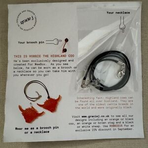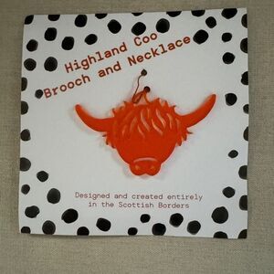 Gracie J. bright orange highland cow necklace and/ or brooch. Made in Scotland NWT