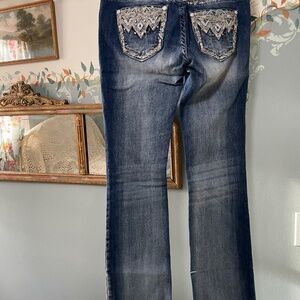 The size 29 boot cut jeans have a nice aqua, silver gold embroidered detail to the front pockets and the back pockets. They have a great western look in good used condition long.
