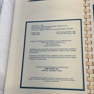 Gracious Goodness! Cookbook By The Junior League Of Macon Georgia 1981 Spiral Bo
