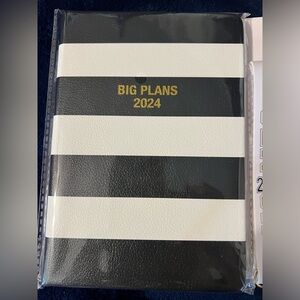 Grad gift bundle includes cute black & white planner / journal with gold writing “Big Plans 2024,” white / gold / black pleather wrist strap with clip, acrylic keychain with tassle and pretty gold pen.