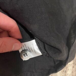 Excellent used condition. Size medium but can also work for size small because of the loose fit. 100% linen. It is a charcoal grey color.