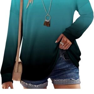 Stylish and comfortable, this gradient teal and black long sleeve top is perfect for any casual outing. Enjoy the soft fabric and relaxed fit. I bought off Amazon and didn’t care for the fit on me. Didn’t return in time! No tags came on shirt but it was never worn.