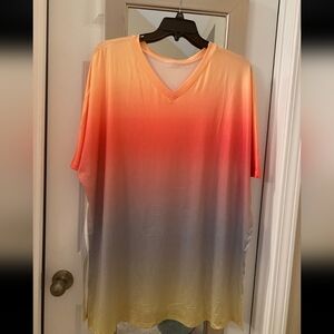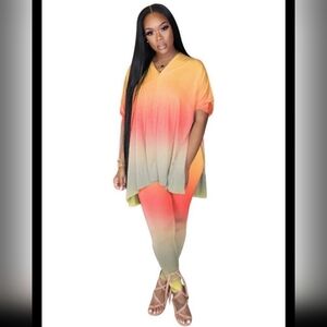 Stylish gradient pantsuit featuring vibrant orange and yellow hues. Perfect for a bold and fashionable look.