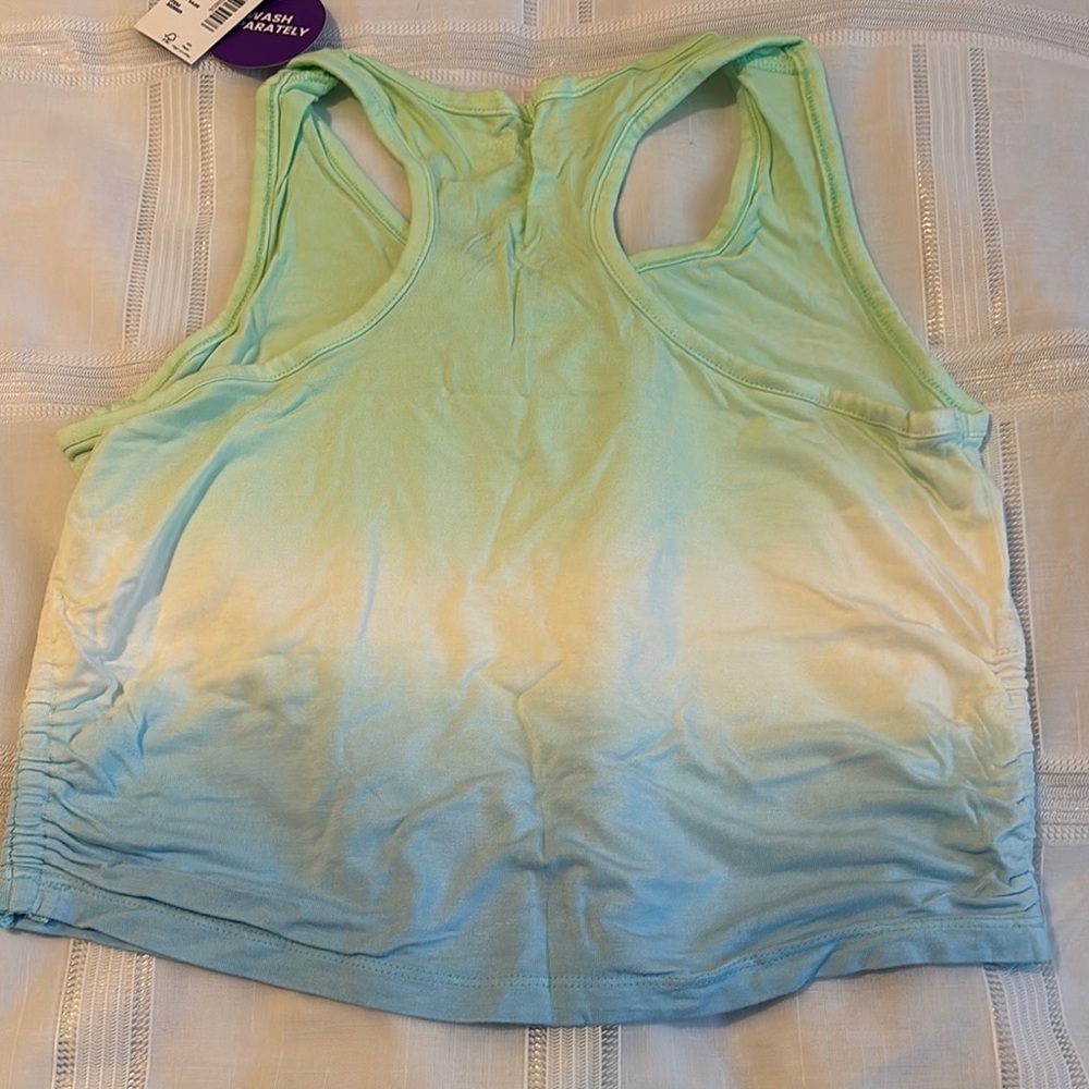 Stay stylish and comfortable with this gradient racerback tank top. Perfect for workouts or casual outings, this top features a beautiful blend of green, cream, and blue colors.