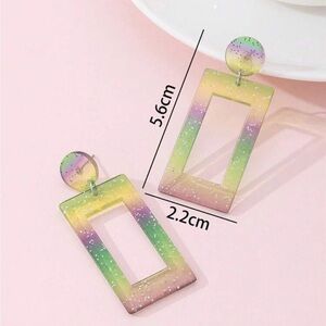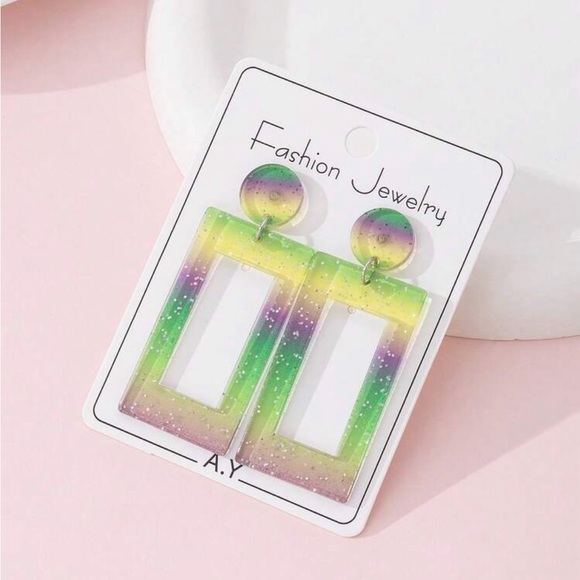Stylish gradient rectangular earrings with a blend of purple, yellow, and green. Perfect for adding a pop of color to any outfit.