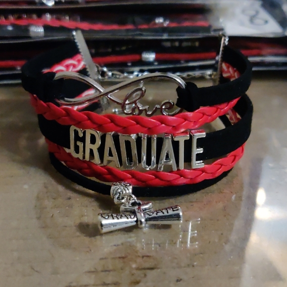 Red and Black bracelet with silver GRADUATE words, diploma charm and love infinity symbol