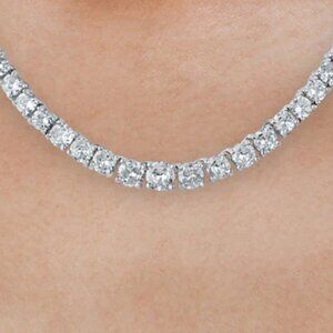This exquisite 25 carat (approx.) classic tennis necklace radiates with brilliant graduated round Cubic Zirconia, stones. Set in rhodium plated sterling silver. Each stone is securely and beautifully set. Its elegant design showcases graduated CZ stones that sparkle from all angles. The above images does not do this stunner justice!
