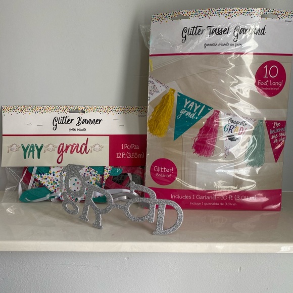 One pair of silver glitter GRAD glasses and 2 sets of garland. Please see pictures for sizes and descriptions