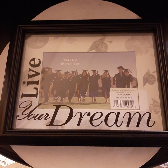 Black shadow box like frame. It holds a 4x6 inch photo. The matting around the picture is white with faded graduation caps. The glass in the frame says Live Your Dream. Can hang or has a stand to sit on a shelf.
